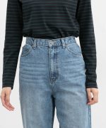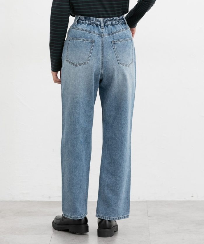 水の使用量を削減し、レーザーによるダメージ加工で薬品を使用せず、環境に配慮して作られた、柔らかめで洗濯後も乾きやすい綿混デニム素材。