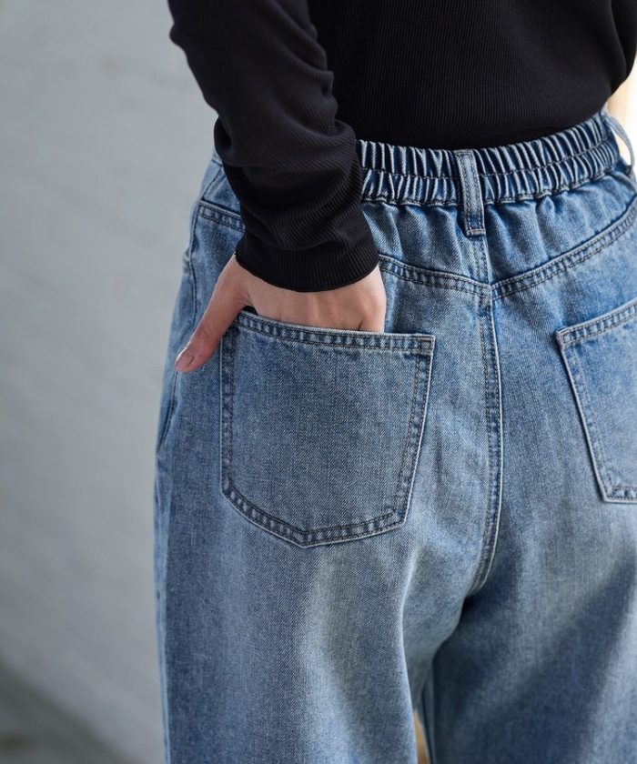 水の使用量を削減し、レーザーによるダメージ加工で薬品を使用せず、環境に配慮して作られた、柔らかめで洗濯後も乾きやすい綿混デニム素材。