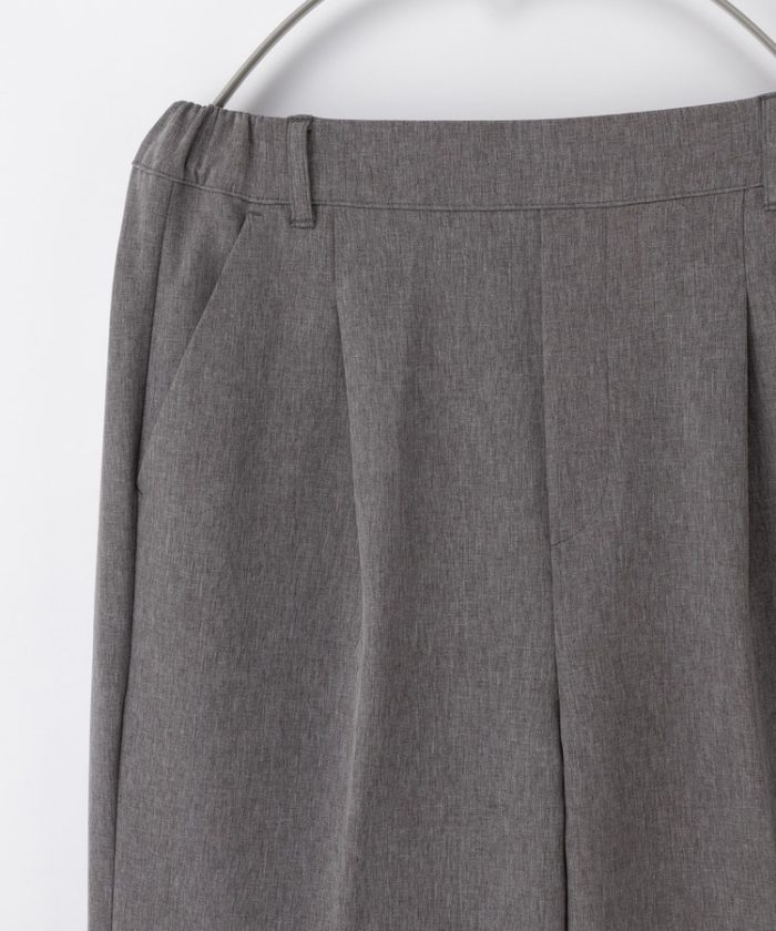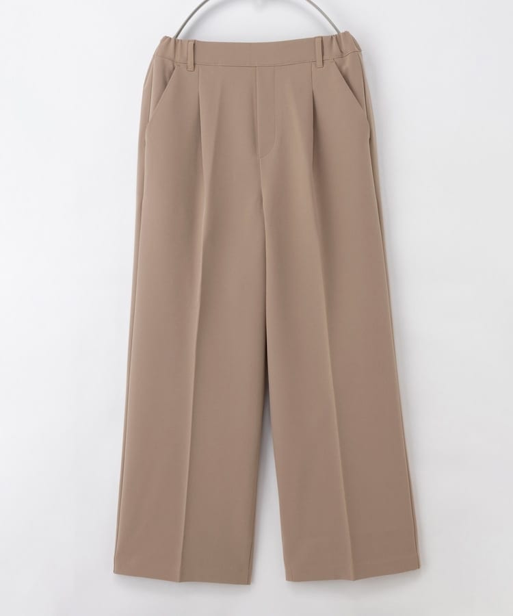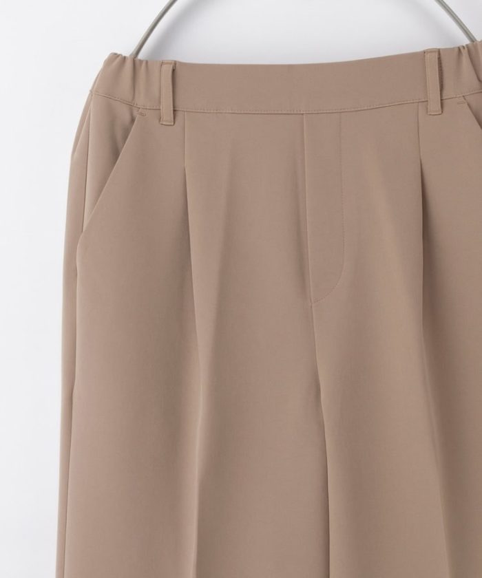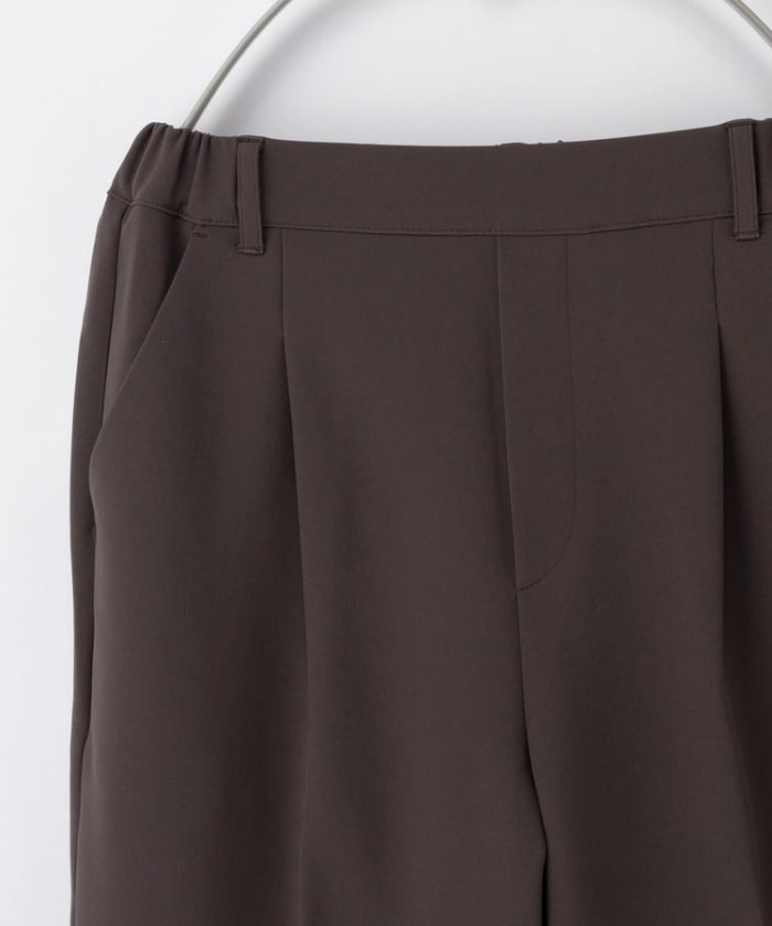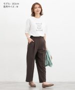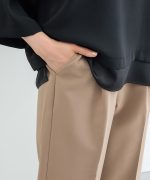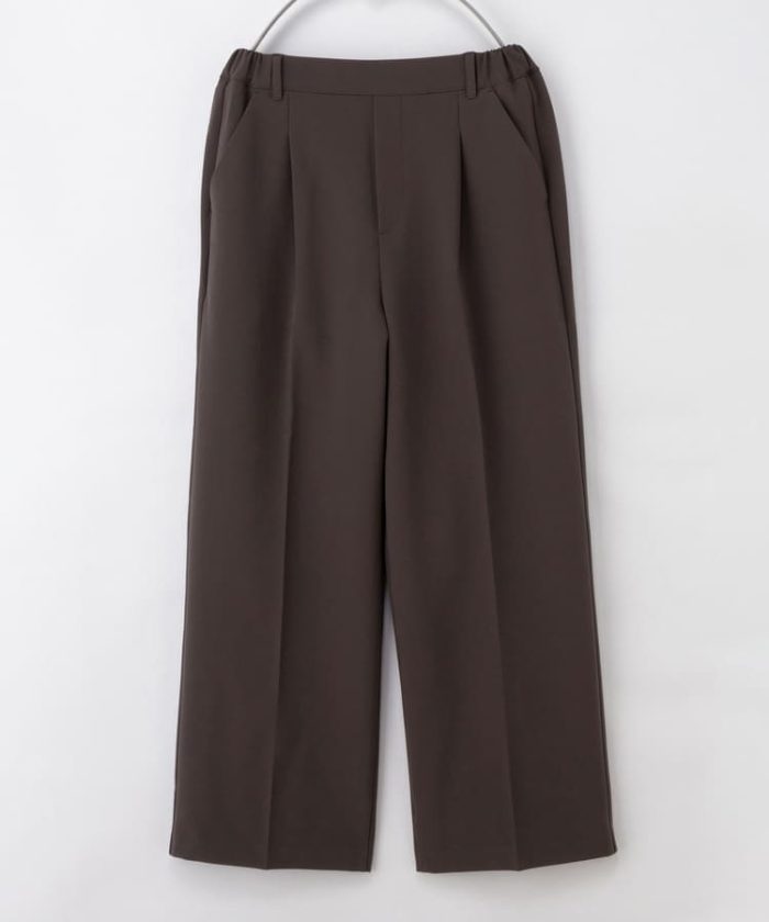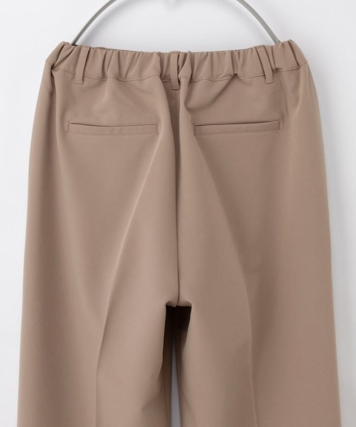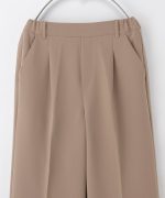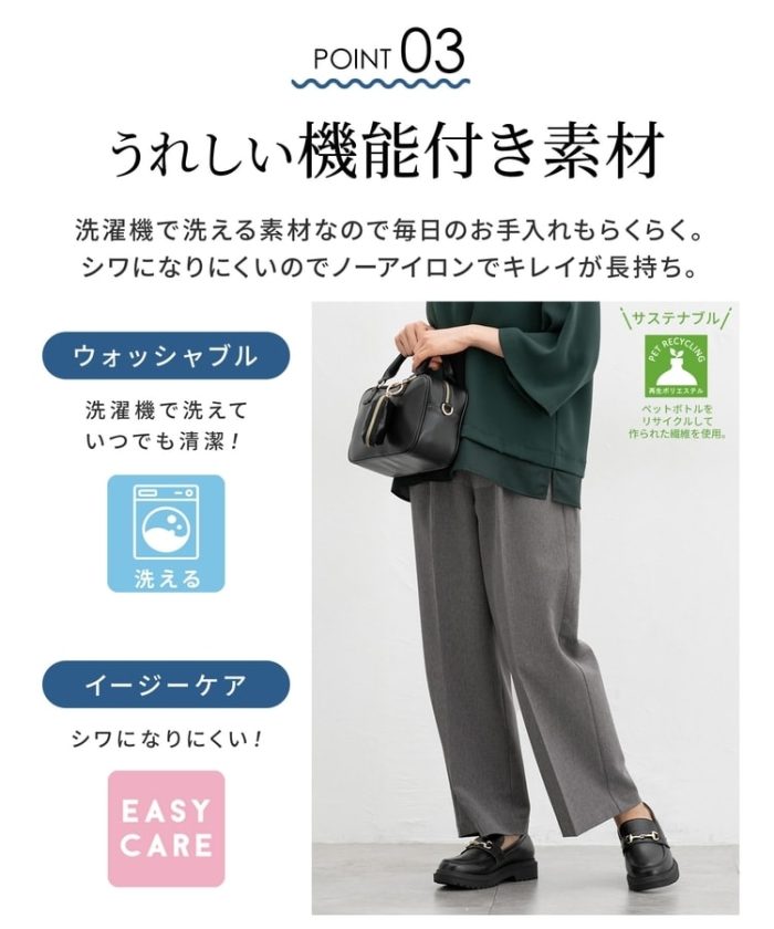 環境に優しい再生ポリエステルを使用した、『ストレッチ』の利いた落ち感素材とウエストゴムでストレスフリーなはき心地。