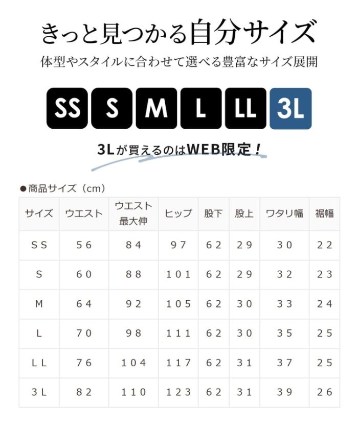 自分にぴったりが見つかる、SS~3Lまで揃った豊富なサイズ展開。
