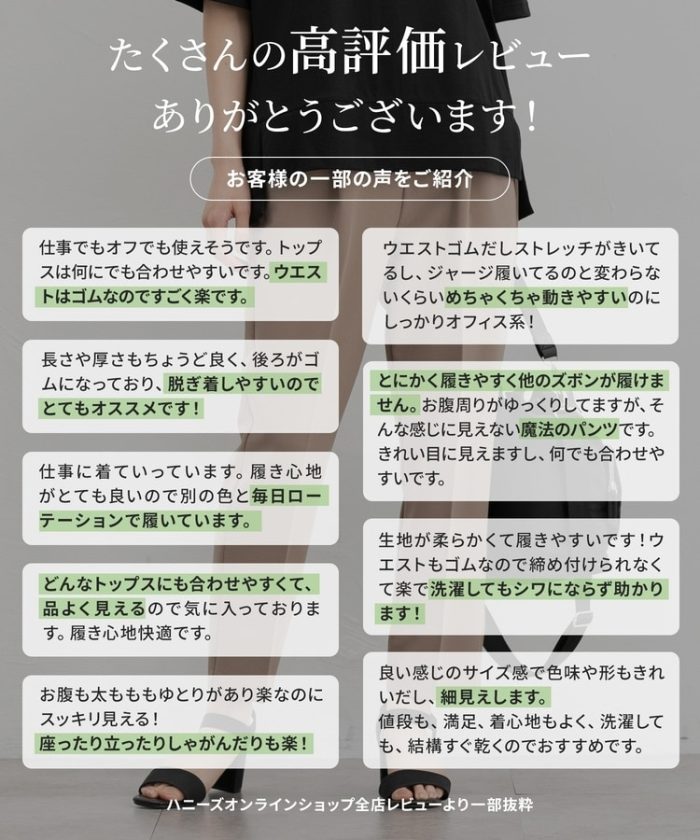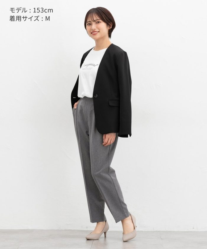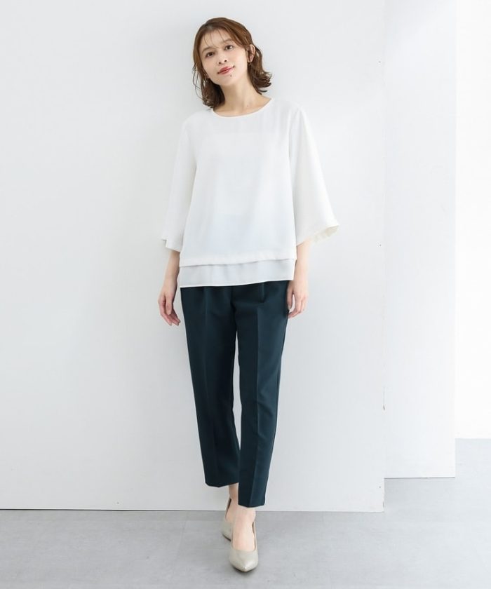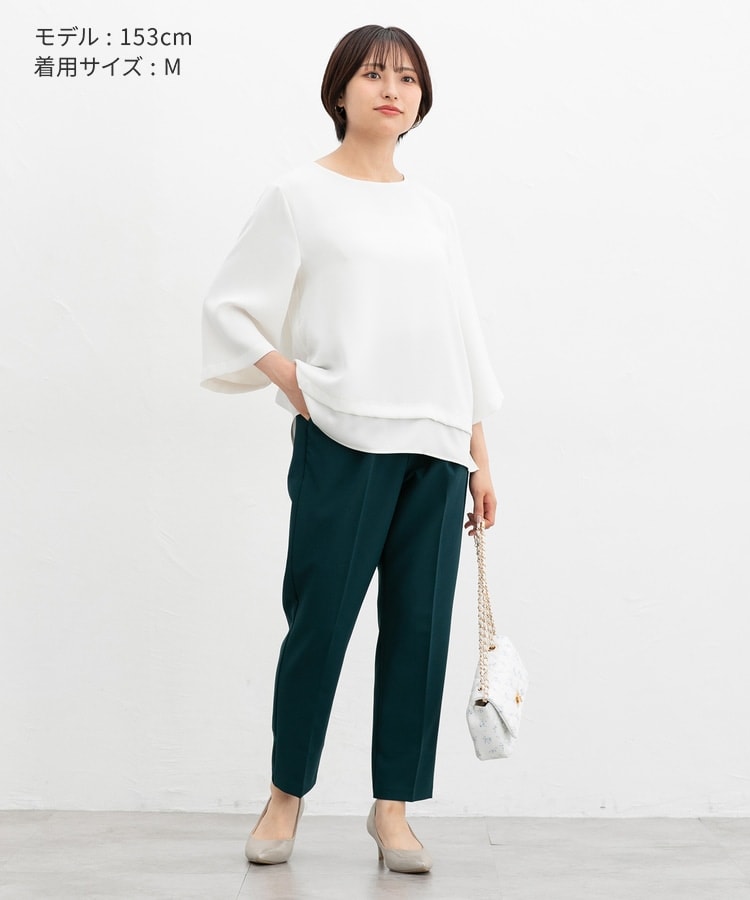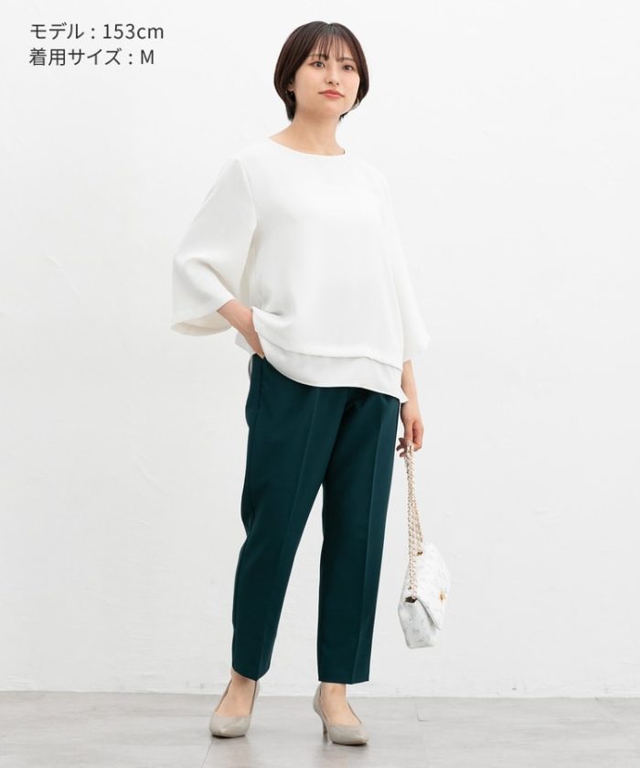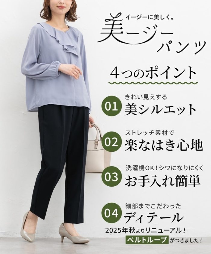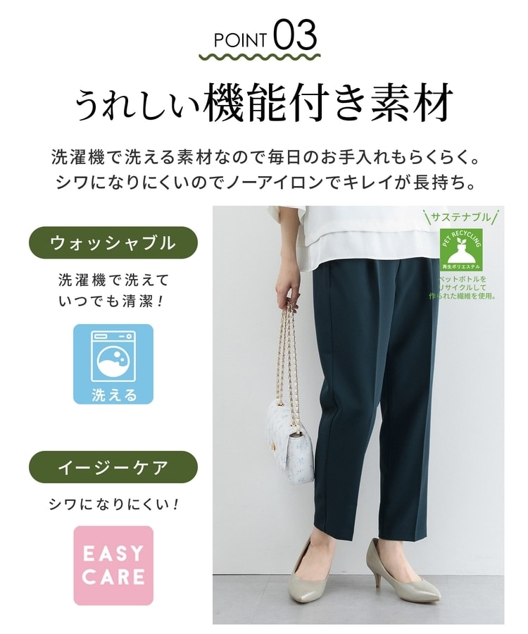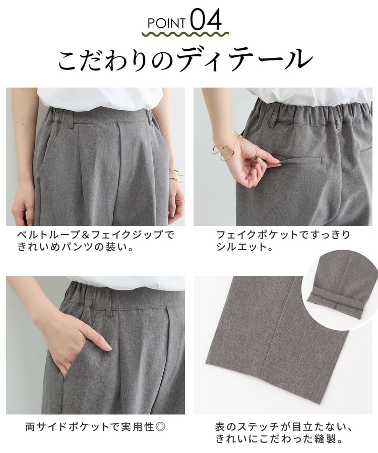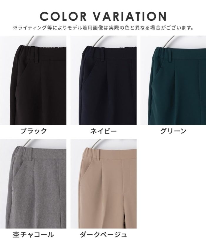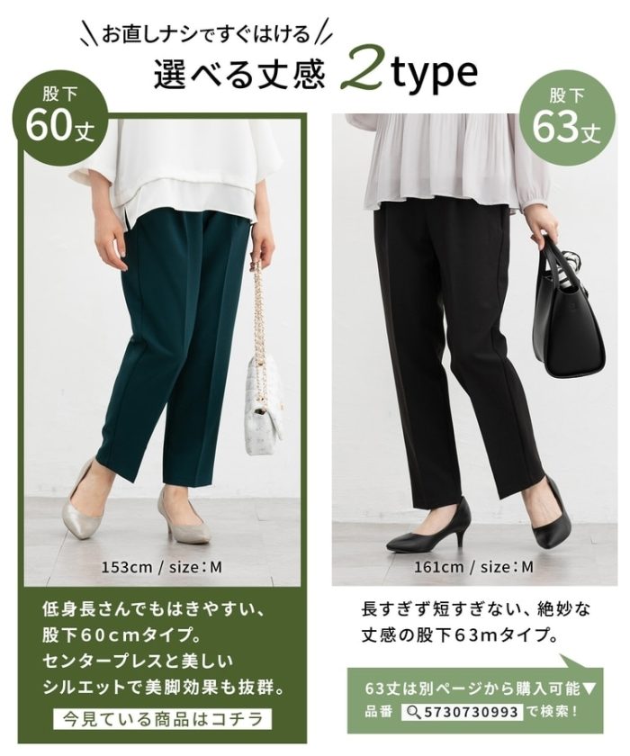 きちんと感のあるセンタープレスと、腰回りのラインにこだわった、裾に向かって細くなる美しいシルエットで美脚効果も抜群。