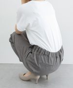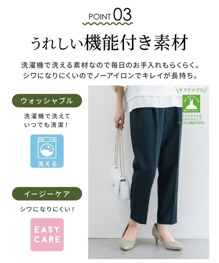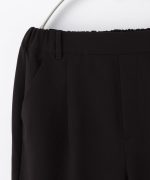 環境に優しい再生ポリエステルを使用した、『ストレッチ』の利いた落ち感素材とウエストゴムでストレスフリーなはき心地。