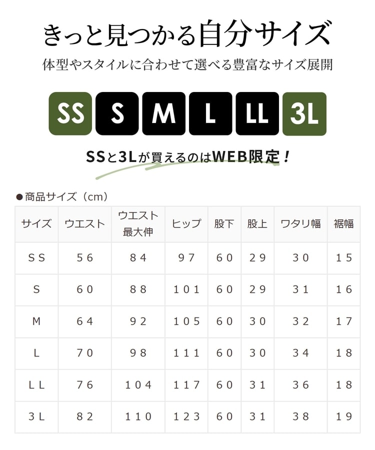 自分にぴったりが見つかる、SS~3Lまで揃った豊富なサイズ展開。